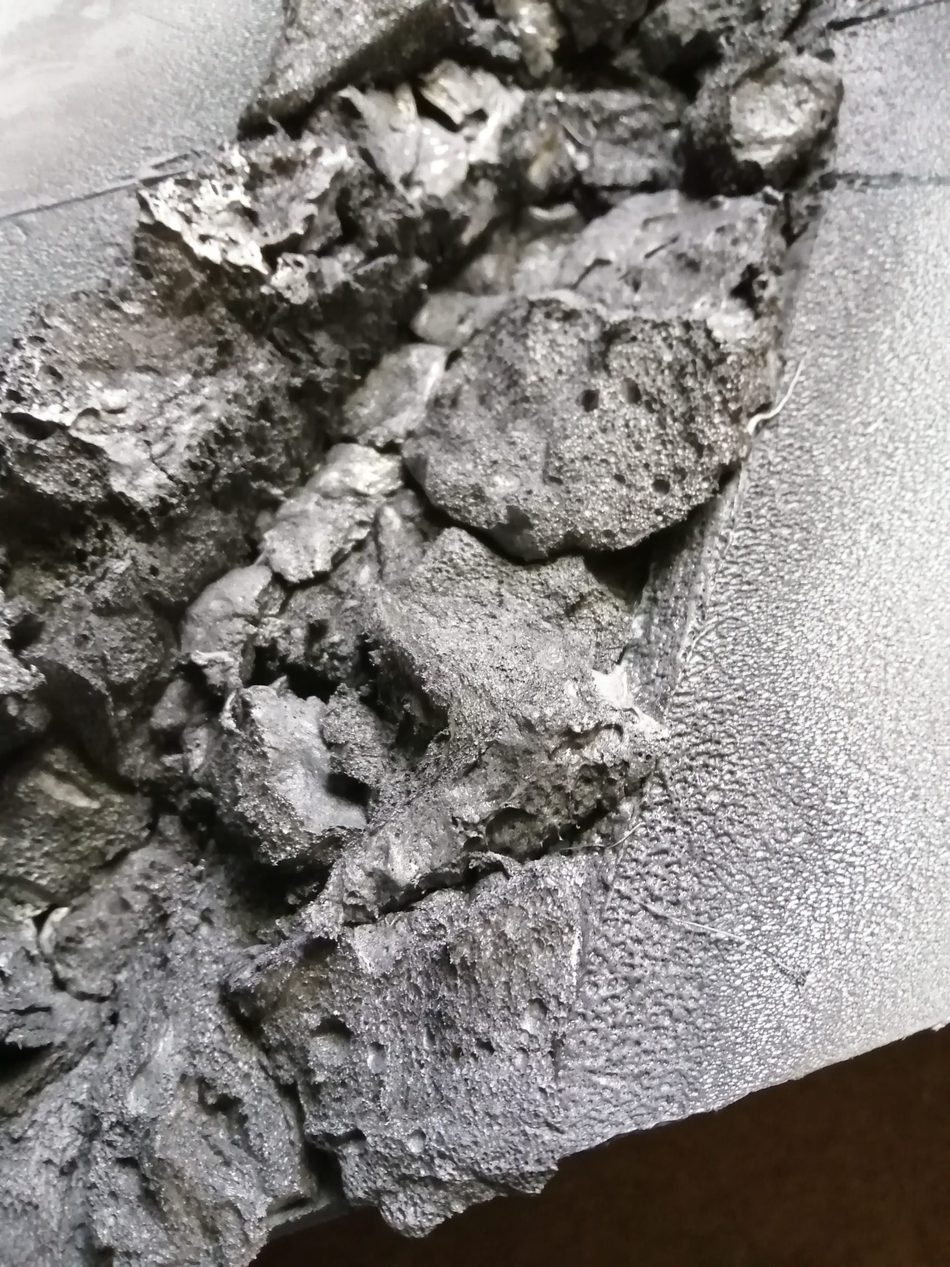 Nadat het P.U.R. is uitgehard ga ik het met een mes te lijf om er brokken uit te halen. Hiermee krijg je een mooie rotsstructuur. Als dit klaar is spuit ik alles zwart met matte verf. Daarna een lichte waas grijs erover en de rotsen zijn klaar. Het meeste zal toch worden bedekt met groen.